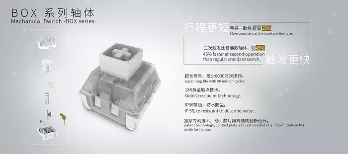 市面上现在还有一种凯华BOX轴,由凯华自主研发,内部结构与Cherry MX轴完全不同,轴体发声结构和触发结构完全分离,内部有绿点推杆,轴体顶部有保护壁,防水防尘级别达到了IP56。在按键寿命上,凯华BOX轴均达到了8000万次。这次终于凯华没抄袭Cherry MX了。