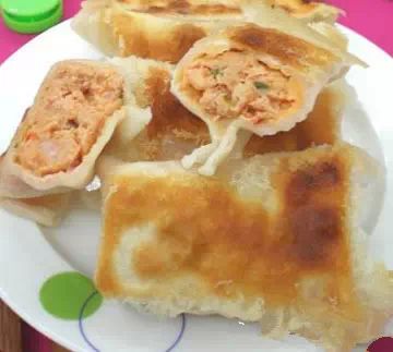 3.将炒好的糯米饭放在面皮上,将面皮对折包好,边缘捏紧,再将两个角捏在一起