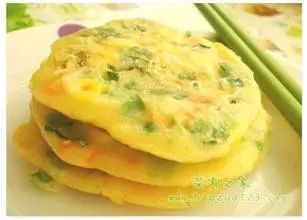 玉米粒50克,胡萝卜30克,生菜30克,鸡蛋3个,面粉100克,葱、芝麻油、胡椒粉各少许;