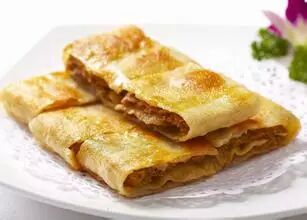 11.平底锅内放油,下入千层饼,小火将其煎黄一面之后翻面,最后煎至两面金黄中间熟透即可。