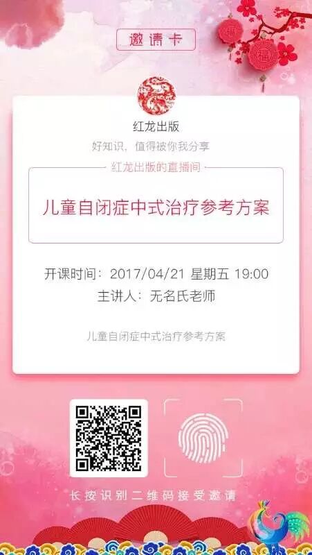 今晚七点,相约红龙出版直播间,无名氏老师在千聊平台讲述儿童自闭症中式治疗参考方案,敬请关注!