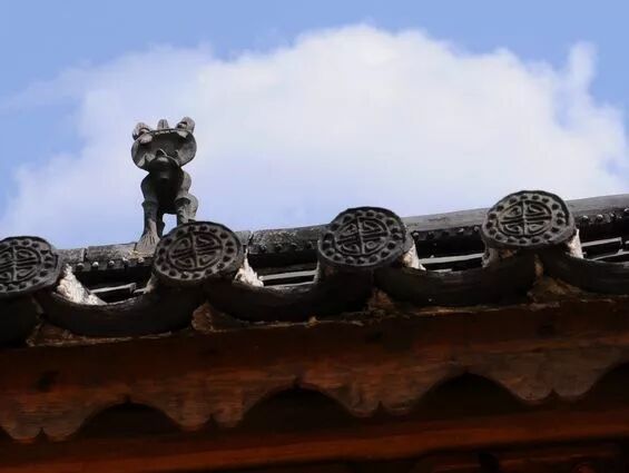 所谓瓦猫,是云南一些地区传统建筑屋顶上的一种饰物。以猫为原型,大张其口,威风凛凛似虎。底座为瓦,可以同其他瓦片衔盖在一起,立在屋脊的边缘,就像是故宫一些宫殿顶上的琉璃小兽。