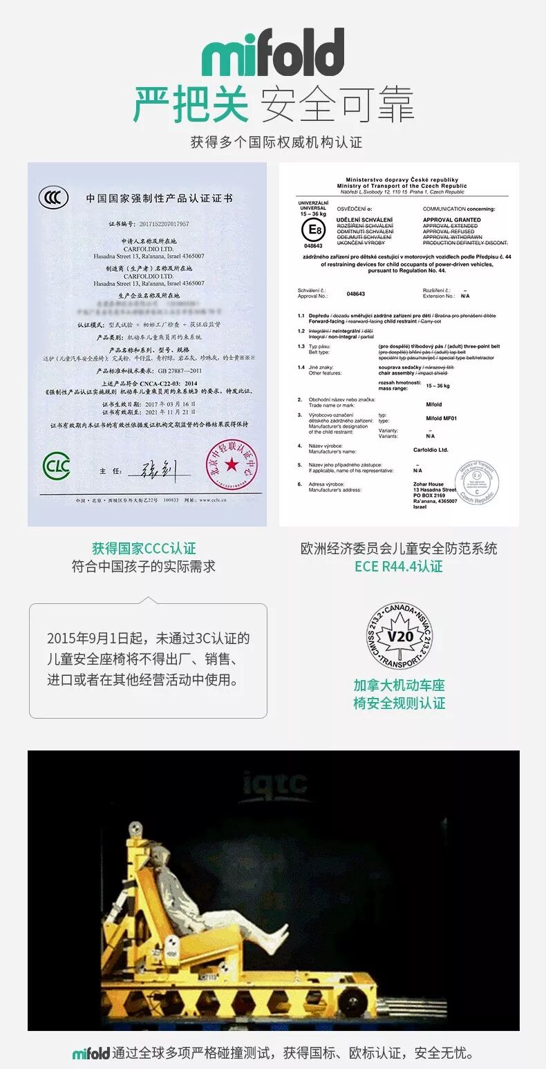 除了欧洲 ECE R44.04外,mifold 口袋安全座椅还通过了加拿大RSSR认证,,以及中国3C认证,安全性有保障。