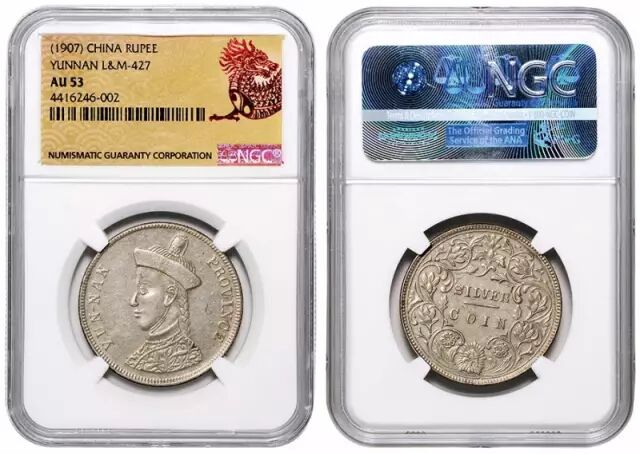 1907年云南省造光绪像双面英文一卢比银币(NGC-ACAB AU53),仿四川卢比设计铸造,俗称“云南卢比”,终未正式铸行,存世极为罕见。