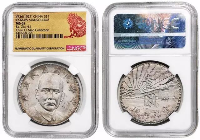 民国十六年造孙中山像陵墓壹圆银币样币(NGC-ACAB MS62),,维也纳造币厂总雕刻师普拉特操刀雕刻模具,南京造币厂试铸,据记载仅试铸四百八十枚,未正式发行,存世较少见。