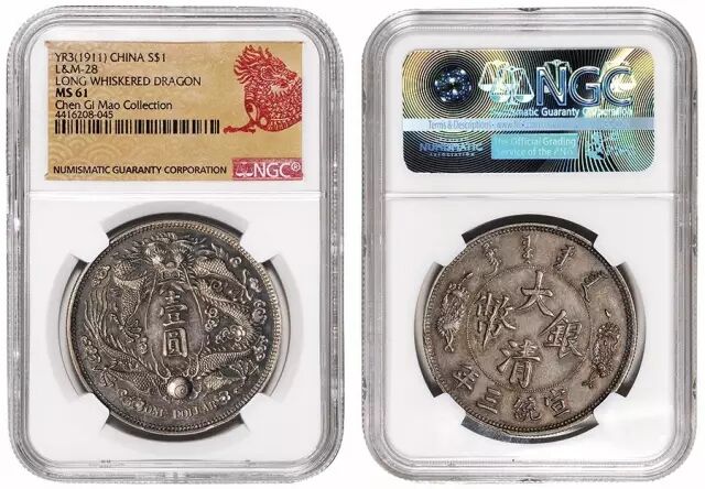宣统三年大清银币“长须龙”版壹圆样币(NGC-ACAB MS61),1911年度支部天津造币总厂试铸,未发行,存世稀少,是宣统三年银主币系列中最具人气的版别,龙银珍品中的常青树,为藏家孜孜以求。同时,此枚还为NGC专家评级ACAB首批入盒,更具魅力。