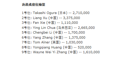 奖金有了保证之后,三人都轻松不少,比赛也加快了速度。最先出局的是日本玩家Takashi Ogura,一手K♥J♥不幸输给Ying Lin Chua的A♣2♦,成为第三名。