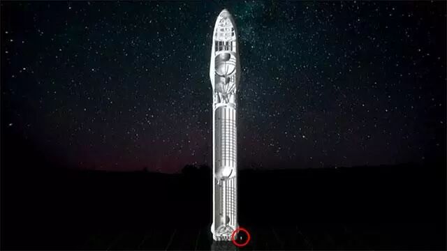 SpaceX星际运输系统中超级火箭BFR与人体的对比图,右下角圆圈内为人体大小