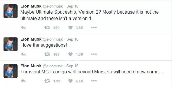 马斯克在9月16日为未来的火星殖民运输器(MCT)征集新名称,并希望它不仅仅只用于火星