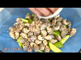 黄瓜打底,倒入花螺,撒上红杭椒装盘备用。