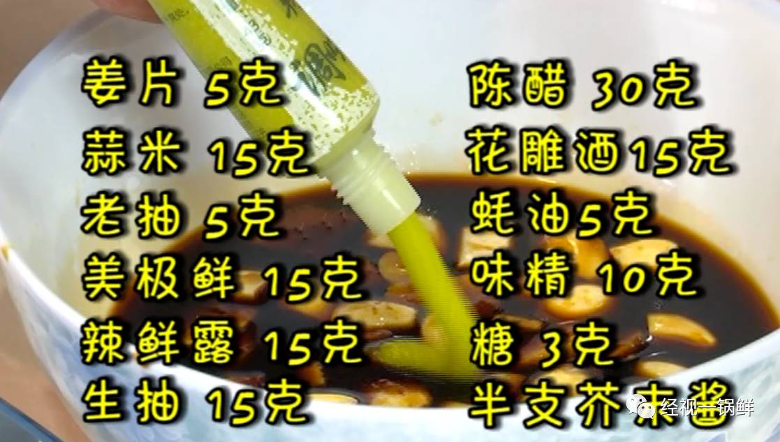 碗里加入姜5克、蒜15克、老抽5克、美极鲜15克、辣鲜露15克、生抽15克、陈醋30克、花雕酒15克、蚝油5克拌匀,然后加味精10克、糖3克、半支芥末酱拌匀,放入小米辣,淋在花螺的上面,这道酱汁花螺就做好了。