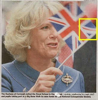 如果仔细观察会发现,英国国旗并非左右完整对称的,里面有着细微的差别。米字内的交叉的红白线是有宽窄之分,这样可以避免将国旗挂反。正确的悬挂方法(下图右)是以旗杆为准,靠近旗杆的两条红白双色米字条纹,位于上方的应该是比较宽的白色区域,红色条纹则靠近下方。