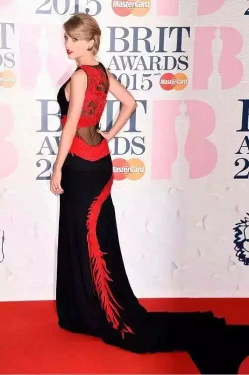 霉霉在全英音乐奖选择一身背部刺龙长裙,虽然只是一个简单的红龙形象,却起到画龙点睛的作用,美翻全场。