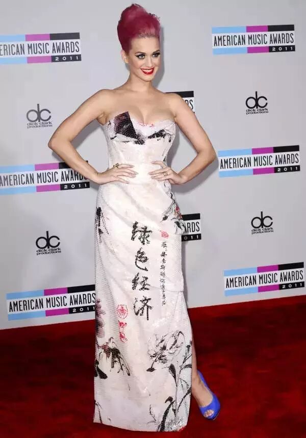 果姐Katy Perry在AMC颁奖典礼是身穿Vivienne Westwood2012春夏系列,整体造型非常美,只是裙子上的绿色经济,水墨山水。。。黑人问号脸!
