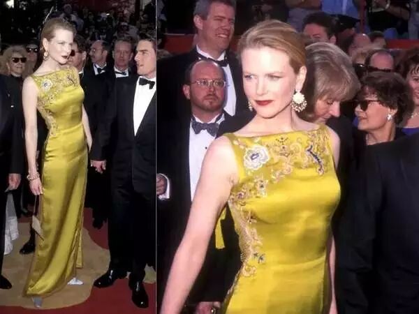 Nicole Kidman在当年奥斯卡颁奖典礼上的Dior断面刺绣礼服,大气的刺绣搭配杏黄色缎面礼服,简单的中国风即使回到现在也丝毫不过时。