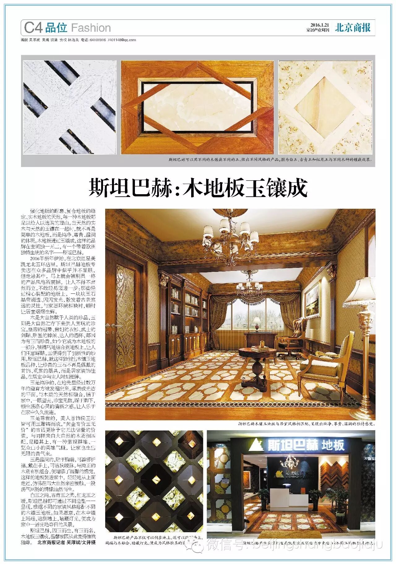 强化地板的耐磨、复合地板的稳定、实木地板的天然,每一种木地板都足以给人以选购的理由。当天然的实木与天然的玉镶在一起时,就不再是简单的木地板,而是纯净、尊贵、温润的体现。木地板通过玉镶成,这样的品牌在世间独一无二,有一个带着欧洲独特血统的名字——斯坦巴赫。2016年新年伊始,在北京红星美凯龙北五环店里,斯坦巴赫地板专卖店在众多品牌中似乎并不显眼,但走进其中,马上就会被别具一格的产品风格所震撼,让人不得不肃然而立,不敢轻易迈进一步:那些经过精心装配的地板上,一块块玉石晶莹剔透、闪闪发光,散发着古老悠远的灵性,与家居环境相映衬,顿时让居室熠熠生辉。木是大自然赋予人类的珍品,玉则是大自然贮存下来供人赏玩的珍宝。皇帝的冠带、贵妇的衣衫、武士的剑鞘、明星的脖颈、达人的酒杯,都因为有玉而珍贵,如今它成为木地板的一部分,被精巧地结合到地板上,让人们任意踩踏,玉便得到了创新性的妙用。斯坦巴赫,就这样独创出木镶玉地板品种,让珍贵的玉石不再是佩戴的首饰、观赏的器具,而是居家装饰佳品,在居室中与主人时刻相伴。玉是纯净的,在地壳里经过数万年的蕴育方被发掘出来,琢磨成光洁的平面,与木质的天然相融合,铺于家中,一眼望去,珍宝无数,踩于脚下,顿生荡涤心灵的清新之感,让人乐于在家中久久流连。玉是尊贵的,美人首饰侯王印皆可用玉雕铸而成,“黄金有价玉无价”的古语更给予它无法估量的价值,与同样来自大自然的木质相匹配,足踏其上,有一种傲视群雄、一览众山小的英雄气概,让家也生出无限的贵气来。玉是温润的,贴于胸前,可辟邪祈福,戴在手上,可洁肤暖脉,与纯正的木质有机组合,便增添了温馨的感觉,这样的地板装进家中,轻轻地从上面走过,仿佛在与大自然亲密接触,一股荡气回肠的情愫油然而生。白玉之纯,古青玉之柔,红龙玉之暖,斯坦巴赫都可通过不同造型一一呈现,根据不同的家装风格搭配不同的木镶玉地板。如果愿意,在木中镶上玛瑙,贴到墙上,暗藏灯光,便成为家中一道光艳夺目的风景。斯坦巴赫,因玉而生,有玉而名,木地板玉镶成,温馨家园从此变得惟我独尊。