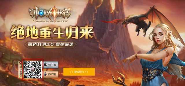 ◆方法二:点击公众号右侧菜单栏——“冰火创世纪官网”进入官网,扫描二维码下载游戏。