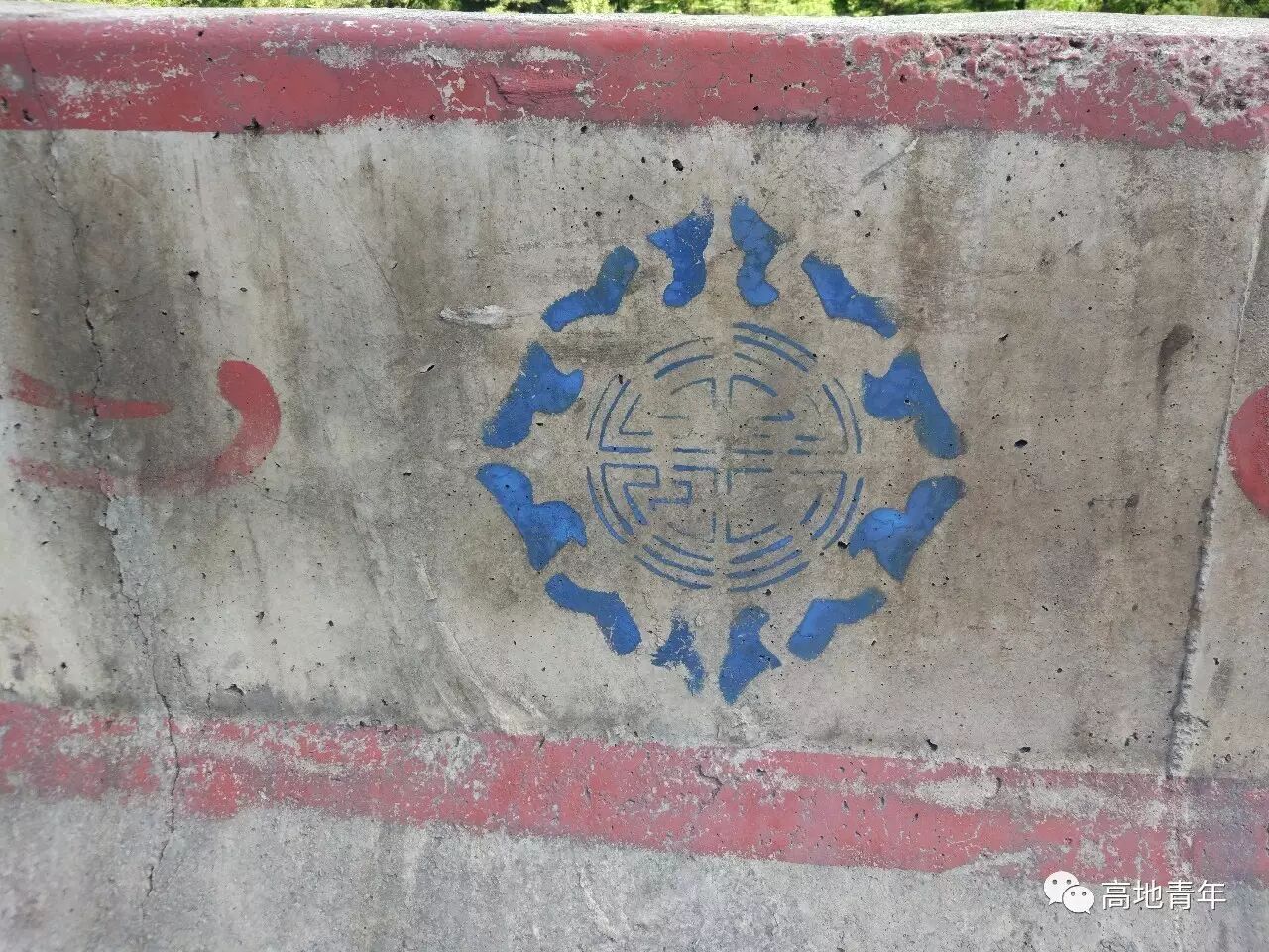 沿路我一直在观察路边的水泥护栏上的图文符号,从开始在大渡河旁边的类似于河神图腾,到山路时由两个菱形交叉形成的图案,到山羊图腾等。很是不解,如果有朋友知道,可下方留言。