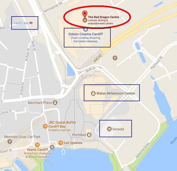 红龙中心地址如下图,从 Cardiff Bay 火车站出来步行5分钟就能到。