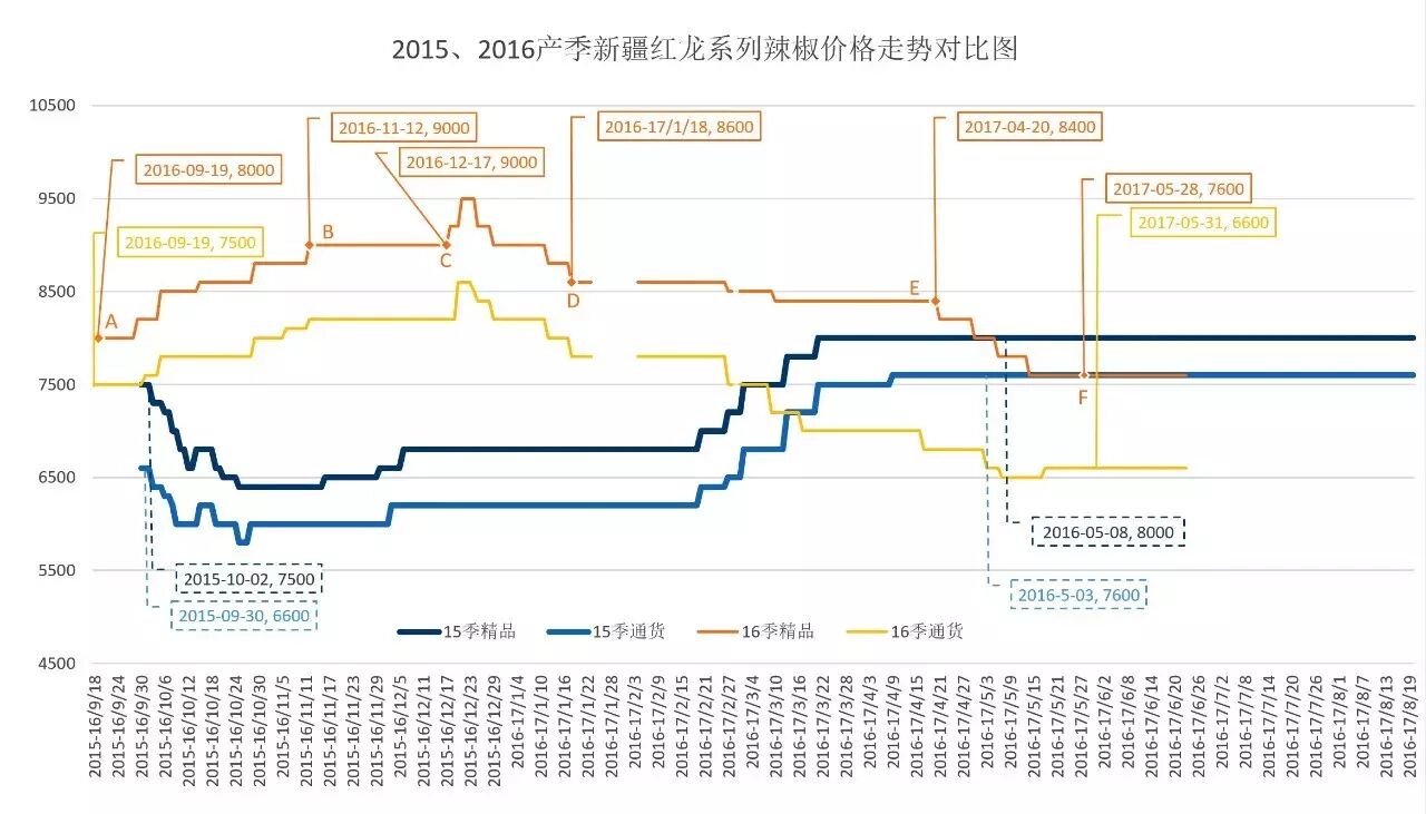 4). 4月中旬开始,大量北疆红龙干度变好,由于受到辣椒行情疲软的影响,价格较年前下滑较大,加上新辣椒开始种植,急于出手,价格相对较低,并逐步下滑(E点-F点),5月下旬以后基本结束。