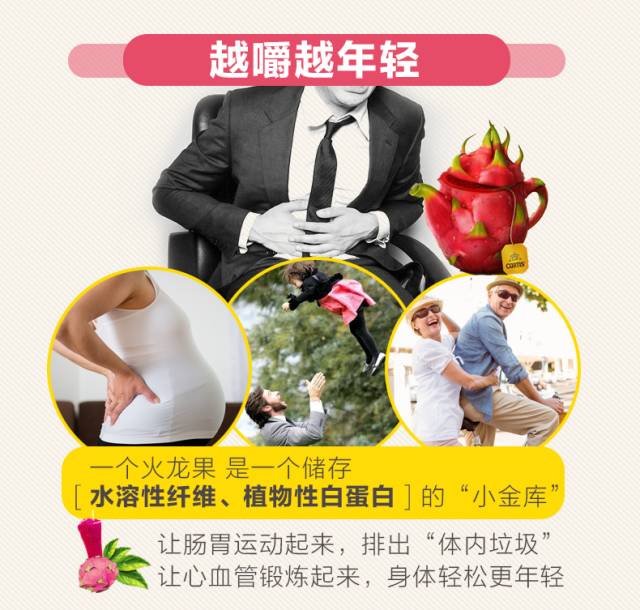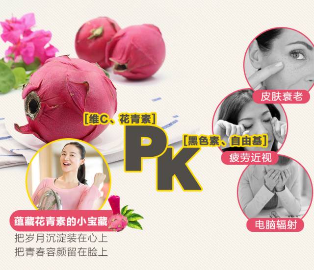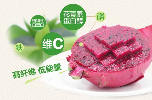 富含更为特殊的成份花青素,尤以红龙果含量最多。花青素是一种抗氧化剂,能在人体血液中保存活性 75 小时,比胡萝卜素强 10 倍以上,抗氧有益!