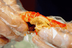 接下来你就能安心带上手套,从最肥的一只小龙虾开始,扒拉下来卡在虾身上的花椒和蒜蓉,一手抓住虾头一手把虾身慢慢揪出来,虾尾还不能断。就算这盘小龙虾做得过咸,也得佯装淡定,把虾头的汤汁都吸吮干净。