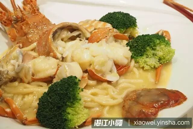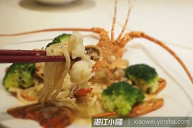 芝士伊面焗青龙虾 龙虾已经开背取肉,底下配上一份伊面,用西兰花做点缀,光看着就食欲大增增增增啊!不用自己动手,只要用筷子一夹,立刻咬一口也是要兴奋到炸裂~