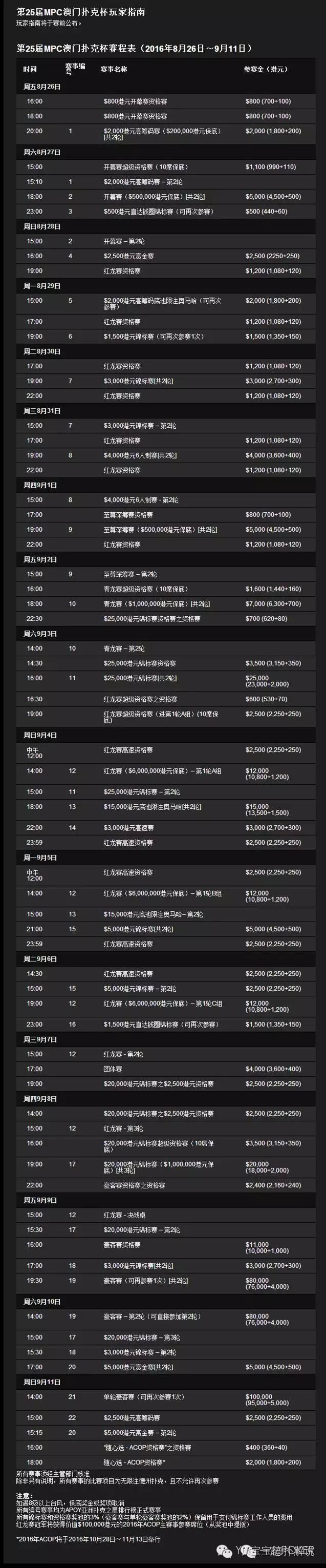 本届MPC赛事为期17天,包括22项APOY亚洲扑克之星排行榜正式组成赛事,其中$12,000港元传奇红龙主赛事保底总奖金高达$6,000,000港元。第25届MPC还有其他多项精彩赛事,其中包括青龙赛、至尊深筹赛、$20,000港元锦标赛以及豪客赛等。