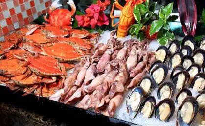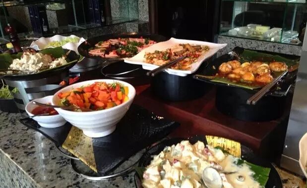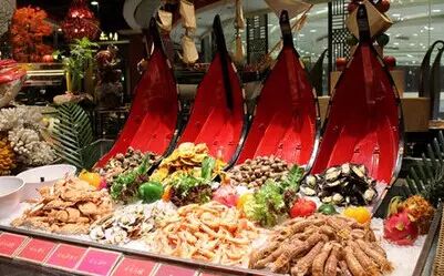 网友:不兔不快liu:酒店就在太阳新天地附近,环境很不错,服务很好,服务员能及时收拾桌面,让人舒服。团购分有几种,有自助午餐和晚餐,还有平日和周六,日的,当然价格也会不同。晚餐的海鲜品种有长脚蟹,三文鱼,墨鱼,烧生蚝,虾,花螺等等,三文鱼切得太厚了,有点腻了。牛扒,羊扒和鹅肝都不错。点心和甜品有好多种,推荐: 雪蛤炖木瓜。供应不错,随便吃,吃得很饱,对得起这个价钱,期待有新的菜品更新,下次还会去。