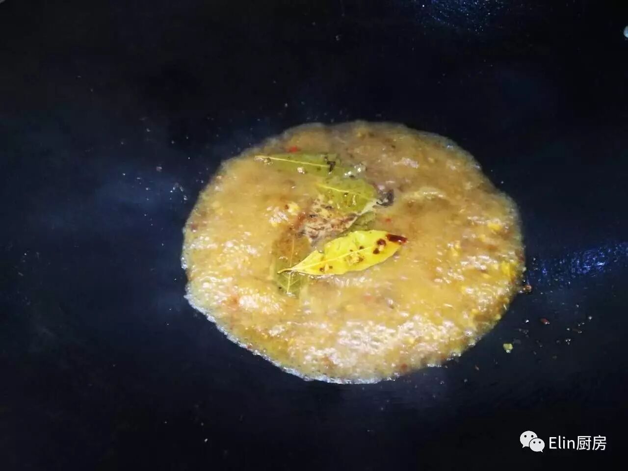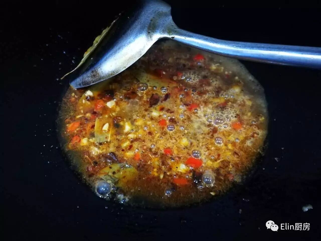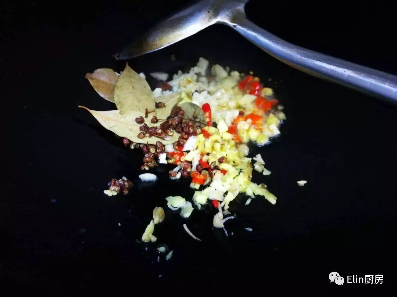 第4步:锅内下油,油热后,放入辣椒,蒜米,姜,香叶,八角,花椒,一起炒出香味