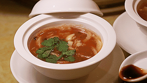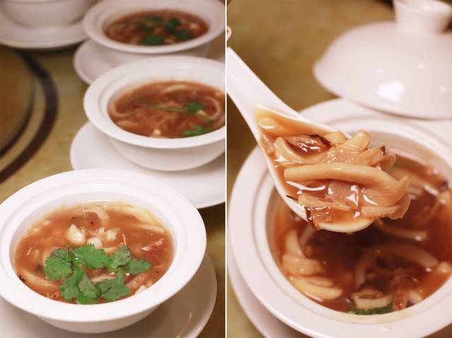 沙鱼皮黏黏糯糯的,很有嚼劲。别看它用小碗装,份量可是不少的,连汤汁一起喝,补充满满的胶原蛋白。