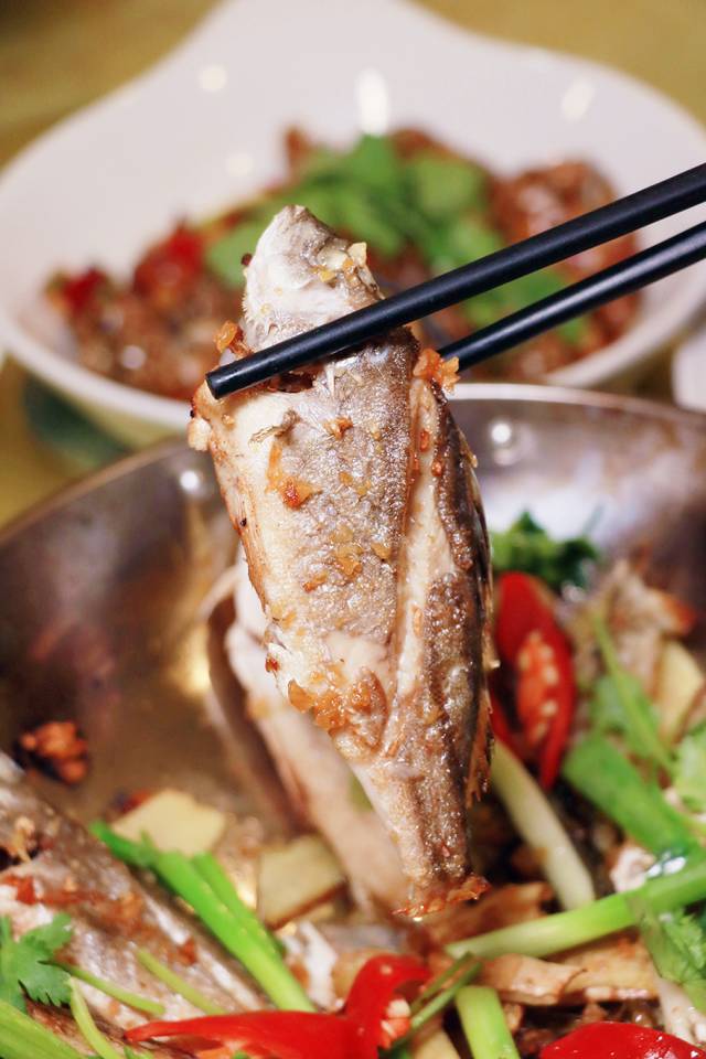 一个鱼鼎都会搭配多种鱼类。做法亦不简单,在开了慢火的锅里,小心翼翼地将鱼贴在锅鼎的边边,控制它不被烘焦,才能保持它的原汁原味。