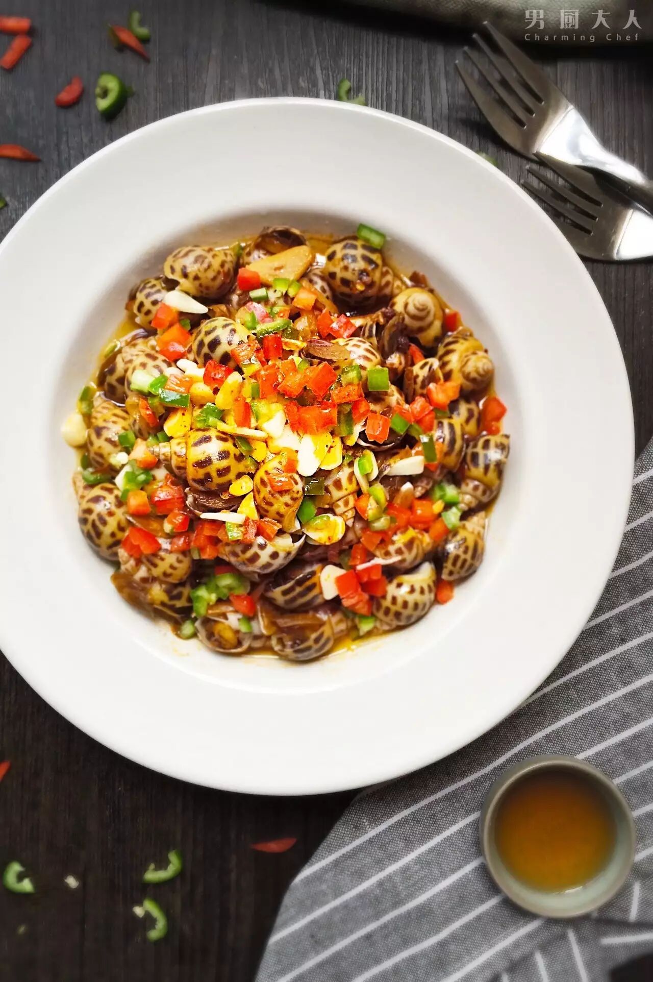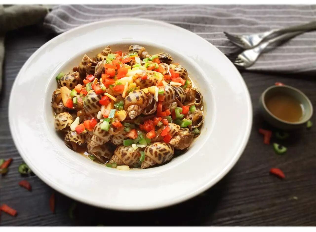 这盘花螺还没开始吃,就能闻到辣椒与蒜被热油淋过后的辛香气味。每颗花螺中都包含汁水,拿起一颗放进嘴巴中吮吸一口,蒜味从舌头中间蔓延开,与酒香一同到达舌根,再到喉咙,而后舌尖满是鲜甜汤汁的味道。一颗接着一颗,根本停不下来。