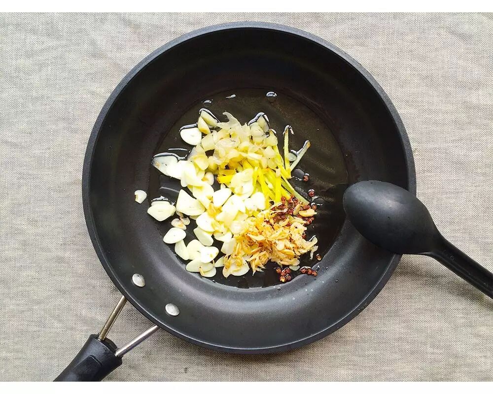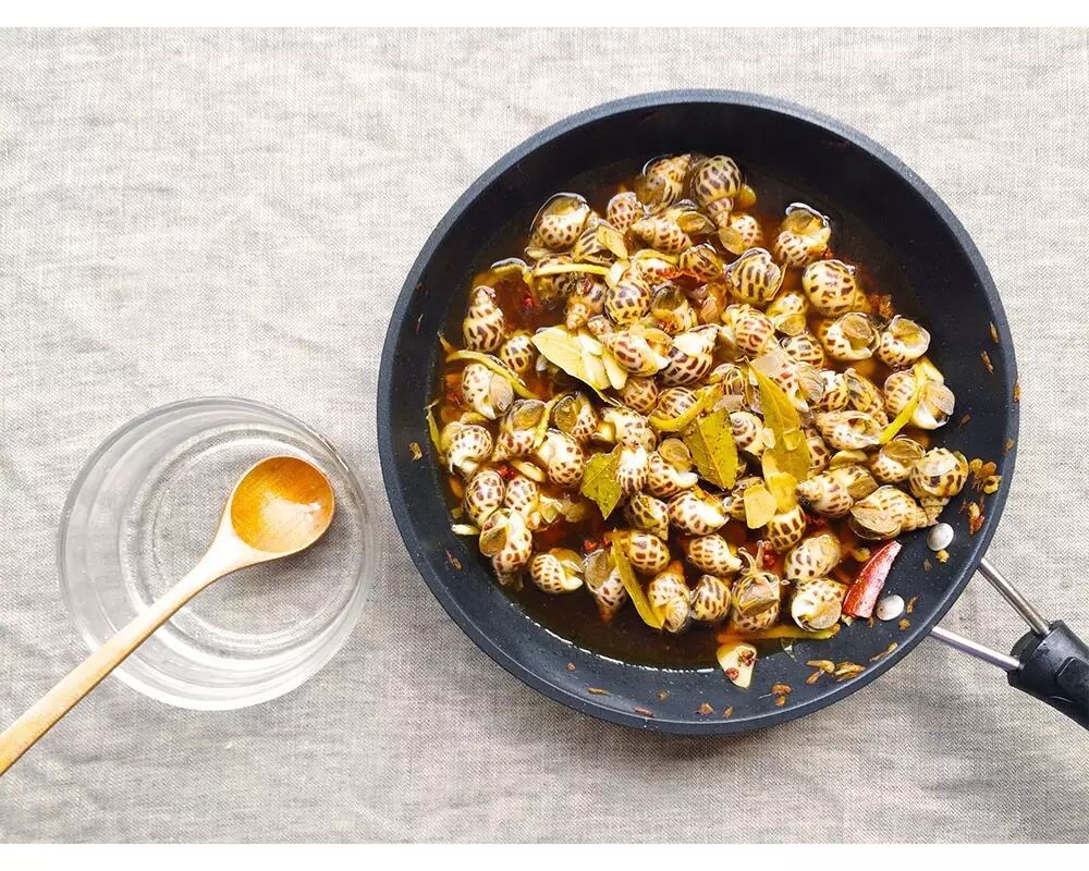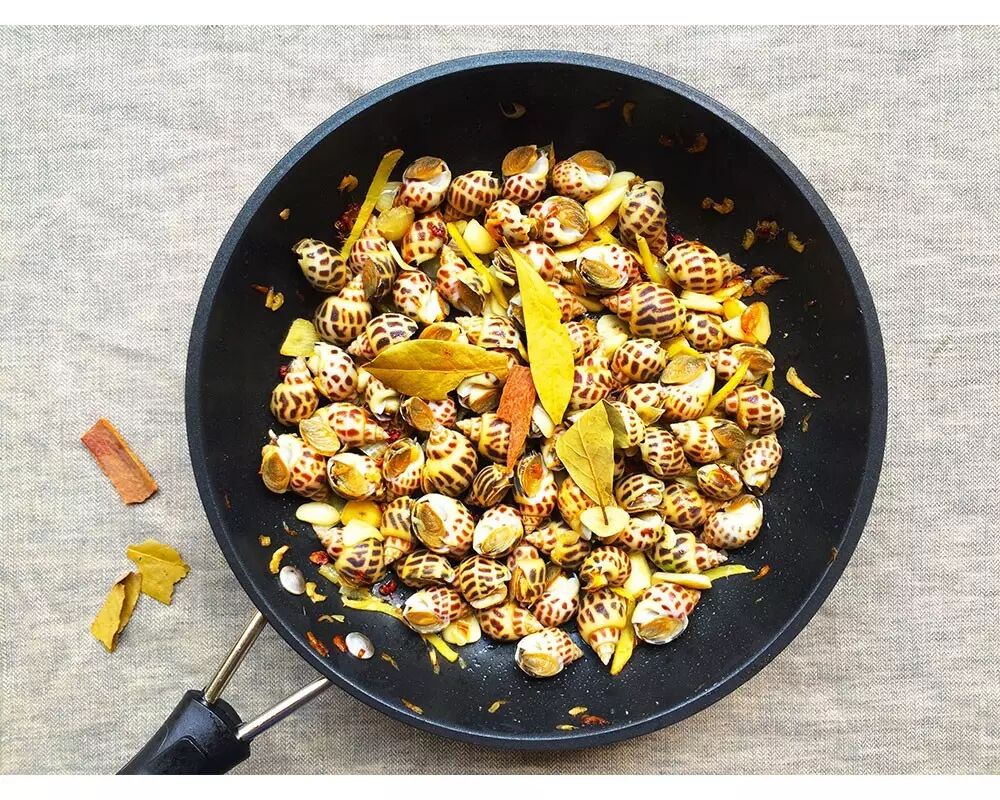 锅内加花生油,放入大蒜片,姜丝,虾皮,酸藠头和花椒爆香,然后放入花螺。