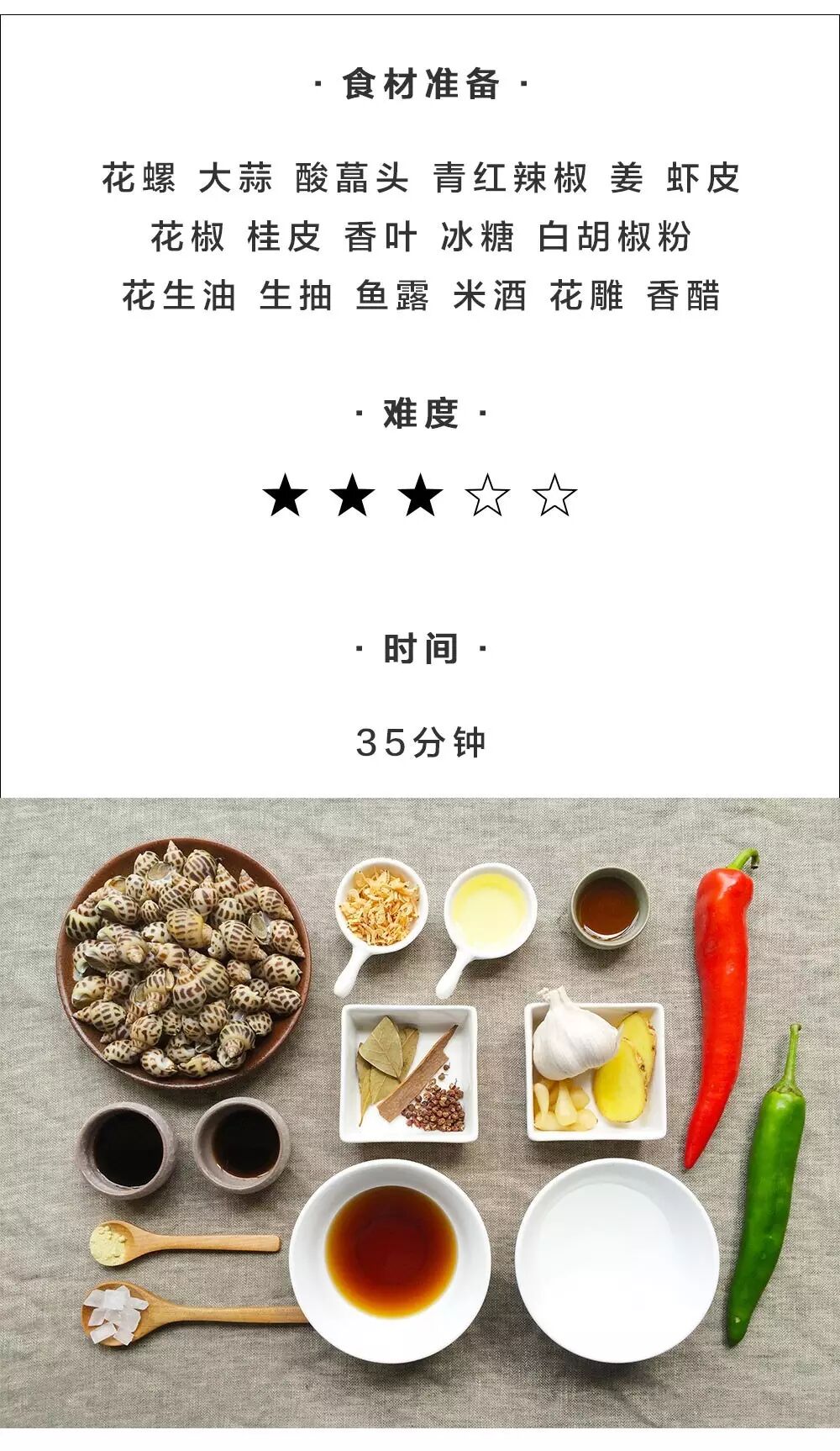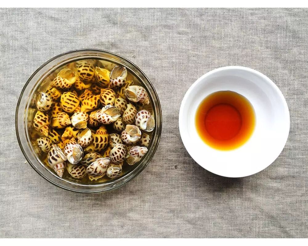 花螺洗净表面泥垢,冲干净黏液后提前放在混合有花雕酒的盐水中浸泡半小时。