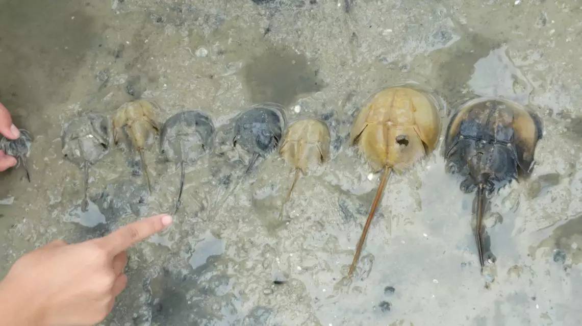 大小不一的幼鲎及鲎壳/师旭摄中国证实分布有两种鲎,分别为中国鲎与圆尾鲎,二者皆列入广西壮族自治区重点保护动物。中国鲎被《中国物种红色名录》列为濒危级别,圆尾鲎列为易危级别。![]()