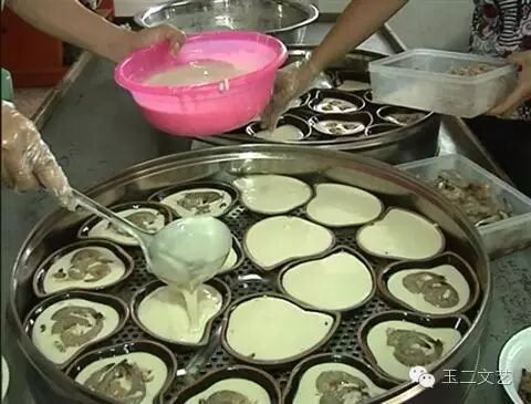 首先把米煮熟,然后待米冷却后,掺入一定比例的茨粉,如果米没冷却就掺入茨粉的话会导致茨粉被烫熟而结成团状,所以一定要待米冷却,再加水搅拌至茨粉刚好稀释,然后倒入磨浆机研磨,成为茨粉和米的混合浆。摆好特做的模具,一般鲎粿都是桃状的,将混合浆倒入,加入猪肉、肉碎、鸟蛋、鲜虾等。然后再拿到锅炉上蒸熟,蒸熟之后拿出来待冷却就做了。