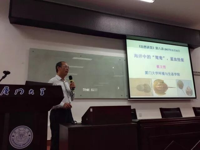 2017年11月11日下午,在厦门大学生物博物馆的114教室,《自然讲堂》第八讲如期与大家见面了。这次讲座我们有幸邀请到底栖动物分类学大咖蔡立哲教授,为我们带来了一场名为《海洋中的“鸳鸯”,蓝血怪鲎》的讲座。