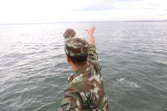 【10】图为为防止中华鲎卷入快艇涡轮,官兵以抛飞方式将其放生1。 李昱颖 摄
