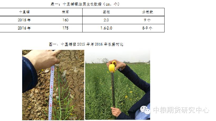十里铺:该镇多为撒播,很少有移栽;据实地观测,本年度油菜籽播种面积与去年相比略有下降(抛荒现象增多);长势方面,今年油菜株高普遍高于去年,角果发育饱满(相比之下去年顶部败育情况明显)。具体生长数据如下: