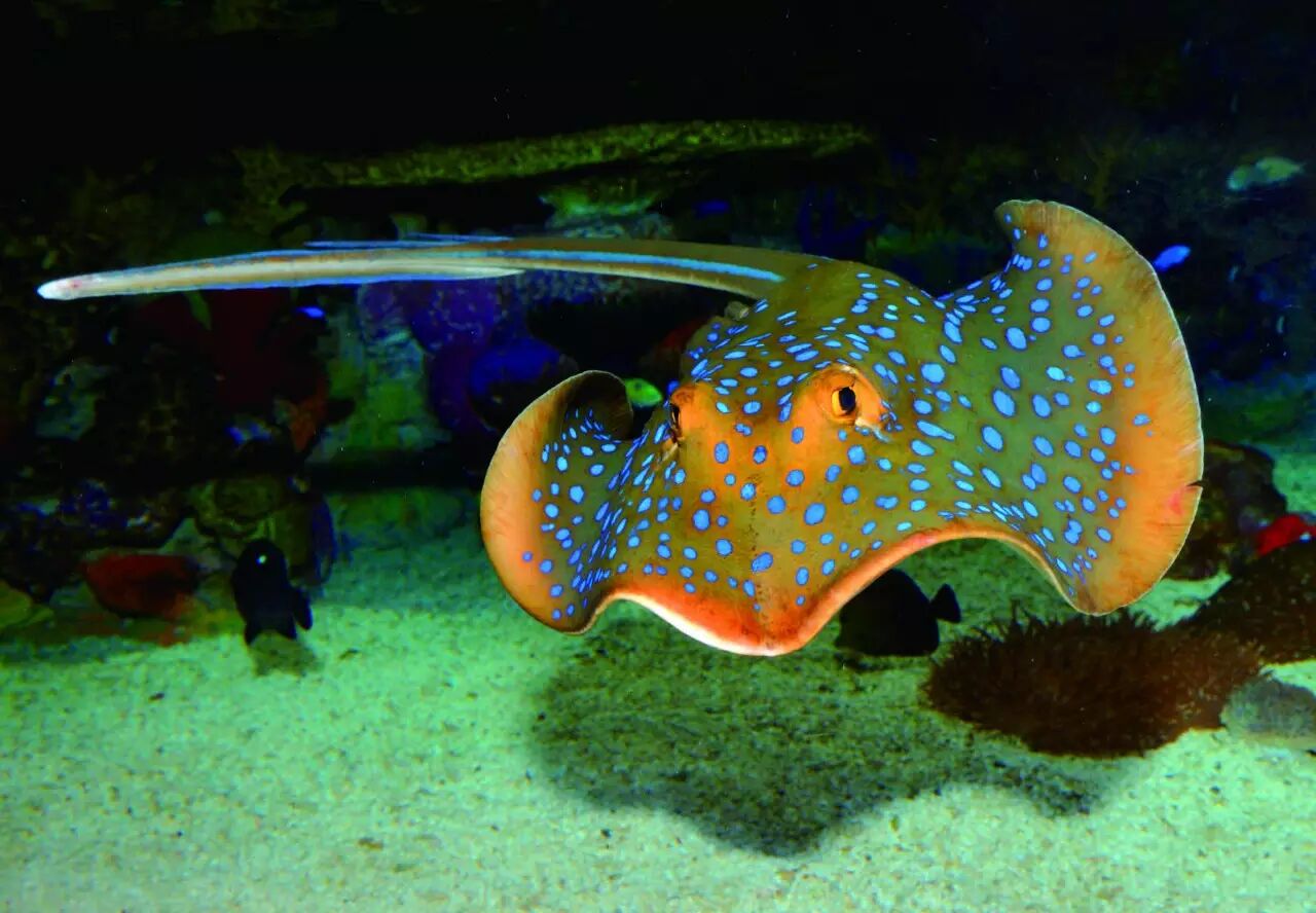 外形特征:身体呈圆盘状,盘体可达50~60厘米,尾部呈鞭状,背部色彩由褐色至淡褐色,上有形似珍珠的斑点散布,因此得名。其腹部纯白色,两眼间距窄,鼻子和嘴巴藏在腹部。