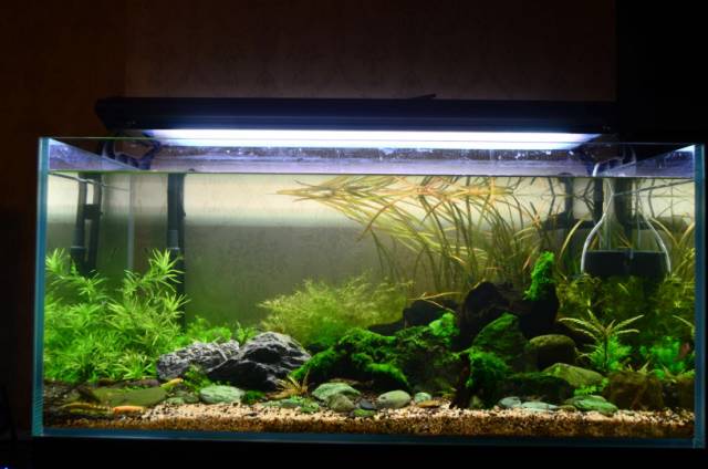 “我还放了很多虾进去。对于鱼缸生态来说,虾很重要,不然一个月水就没法要了。要不是虾天天用小爪子捣藻类,很快就会长藻,同时虾也可以喂鱼吃,而鱼抓虾的时候,虾子可以躲进后面的小竹节水草里。”