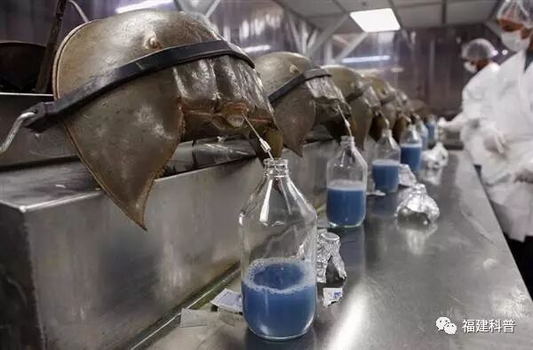 19世纪50年代,科学家在鲎的蓝色血液中提取出一种凝血剂,称为鲎试剂。这种鲎试剂不仅能马上检查出患者是否被细菌感染,为急症患者的诊治做出快速诊断,还是一种检测药品和医疗用品中是否含有病原菌的既简单又可靠的方法。我们注射的疫苗,就要通过鲎试剂的检测。在鲎试剂中滴入注射液,如果试剂立即凝固或变色,则说明注射液内含有致病的细菌内毒素;如果试剂不凝固,就说明疫苗是安全的。鲎试剂还广泛应用于检测饮用水、牛奶、罐头等食品是否受到细菌污染。