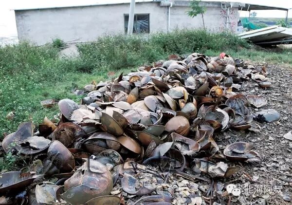据广西渔政部门一位工作人员回忆,1999年的时候,北海的鲎可以用“堆积如山”来形容,“一到夏末入秋的时候,外沙港码头、南氵万码头、银滩、地角,这些地方的沙滩上满满都是鲎,而且是一只叠一只,整个沙滩都没有落脚的地方,甚至连垃圾筐里都装满了渔民为挖螺而打死的鲎。”
