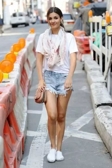 身高約166公分擁有理想身高的Victoria Justice 替我們示範了最簡單基本的清爽牛仔穿搭,白T裇加白球鞋,稍嫌單調利用絲巾點綴,另外你有注意到她短褲的小心機嗎,再次強調,如果對於大腿曲線很有自信的女孩,挑選這種斜邊設計的款式,讓腿部延伸更修長吧。