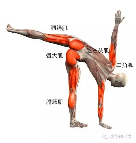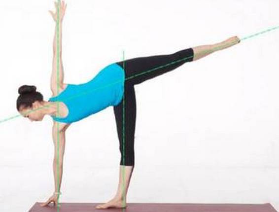 手臂伸展,肩关节外展,脊柱向前伸展拉长,站立腿和上抬腿伸直,膝关节伸直,在身体的侧面骨盆中立位。