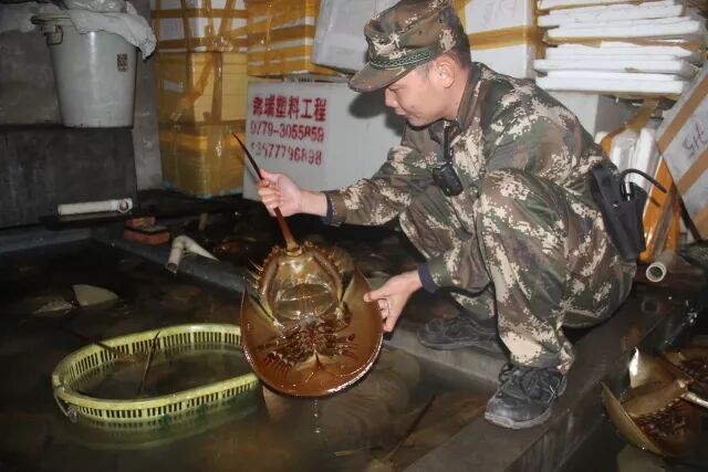 该所官兵与北海市渔政渔港监督支队进行联合清查,例行检查到海角路某铺面时,发现该铺面房屋光线较暗,铺面内水池内有大量的大小不一的东方鲎,经过现场的清点,水池内共有东方鲎276只,均为活体状态。
