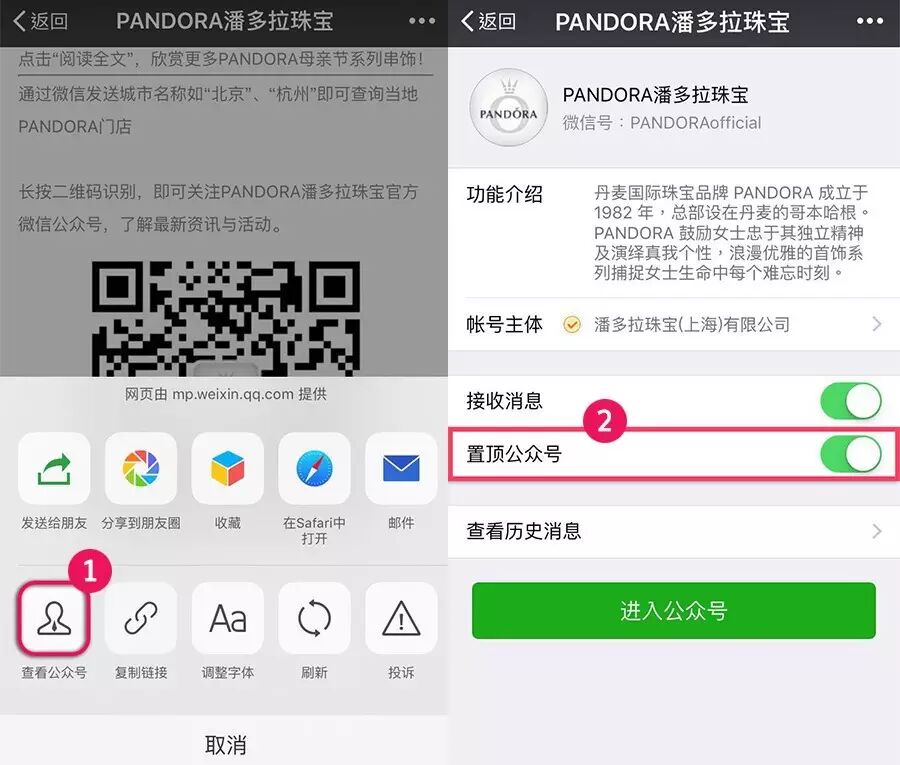 新版微信可以置顶“PANDORA潘多拉珠宝”微信公众账号了,只需点击进入微信主页,向右滑动“置顶公众号”的按钮,以后就能第一时间找到我们啦!