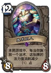 蛇发女妖:就是复制奥术巨人用的,而且是金色的哦。没有这张橙卡的话,可以用模拟幻影来代替,卡组中本来随从就不多,巨人减费后很容易复制到手。