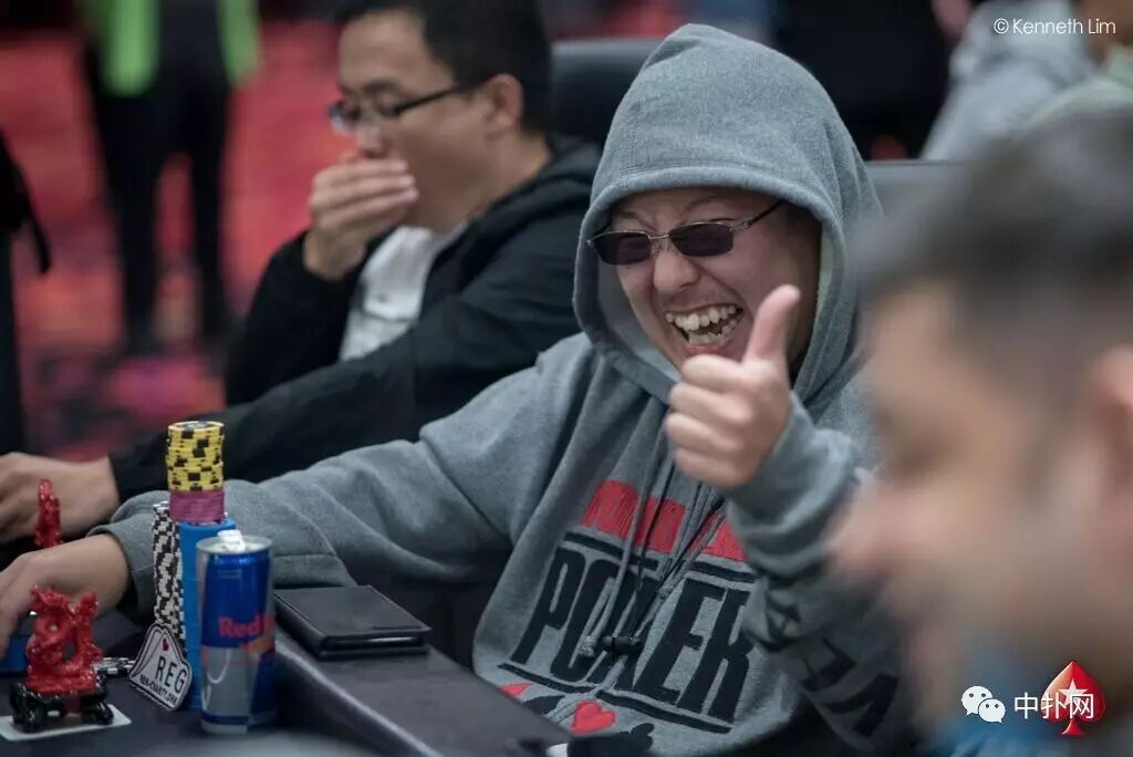 摊牌位:小风:Q♦ J♦ ,SB位:K♥ K♠,BB位:A♦ A♠ ,再次引起牌桌惊呼。